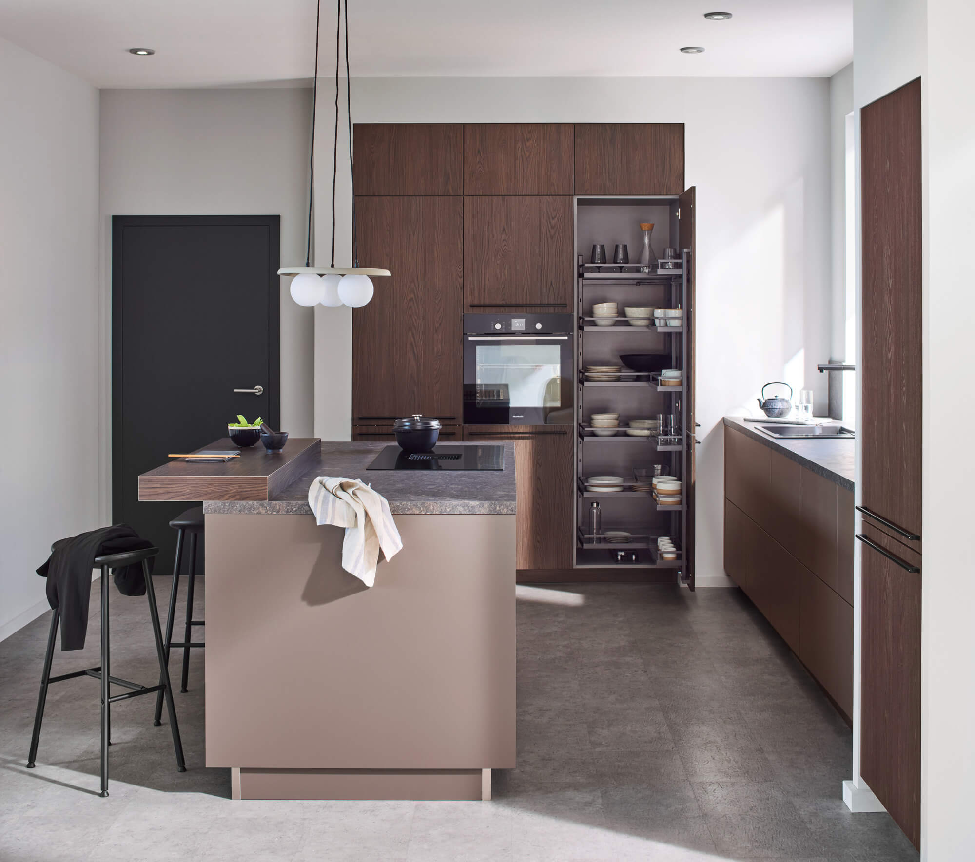 The Convoy is an inside pull-out with infinitely height-adjustable shelves. The elegant solution is not attached to the front panel and is suitable for wide larder units.