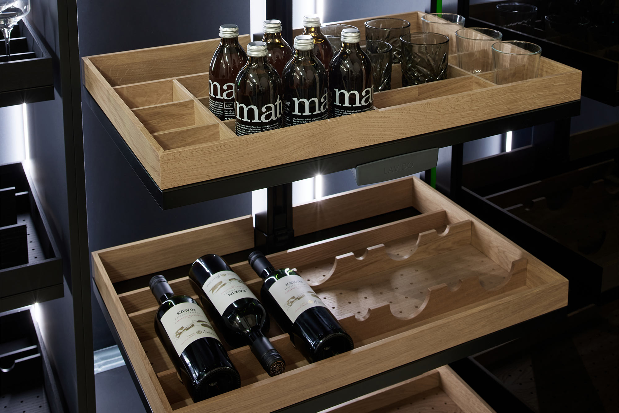 Dans le cas de "TANDEM Solo", les étagères se déplacent en douceur vers l'utilisateur à l'ouverture de la porte et offrent ainsi une vue d'ensemble à 100 % en un seul geste. "CONVOY Lavido" est une solution de rangement indépendante de la façade qui convient à de nombreuses situations d'aménagement, par exemple derrière des portes coulissantes. La colonne haute présente le contenu sur des étagères flottantes de manière esthétique et émotionnelle. Elle offre une transparence et un accès sur trois côtés.