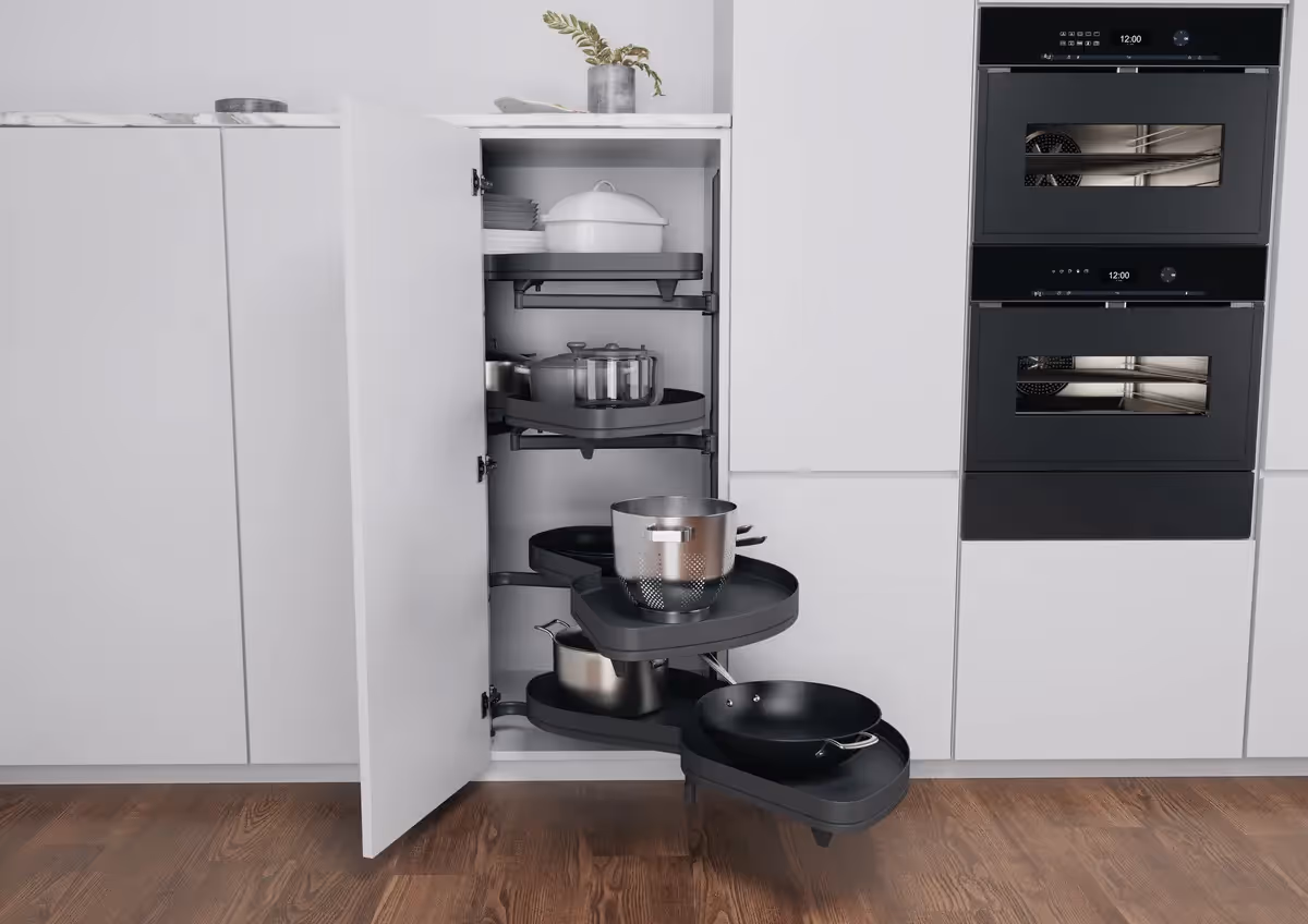 La scaffalatura da cucina REVO 90 è una soluzione interessante per l'soluzione per angolo in cucina. Grande capacità di carico di 25 kg per ripiano e Regolazione in altezza continua regolabile Regolazione in altezza continua .