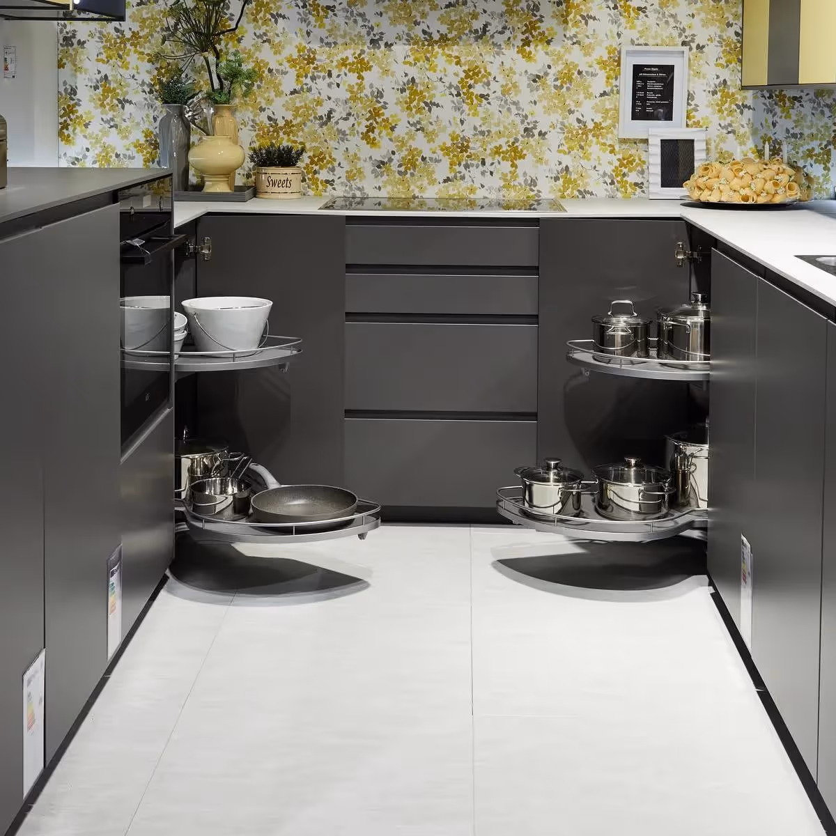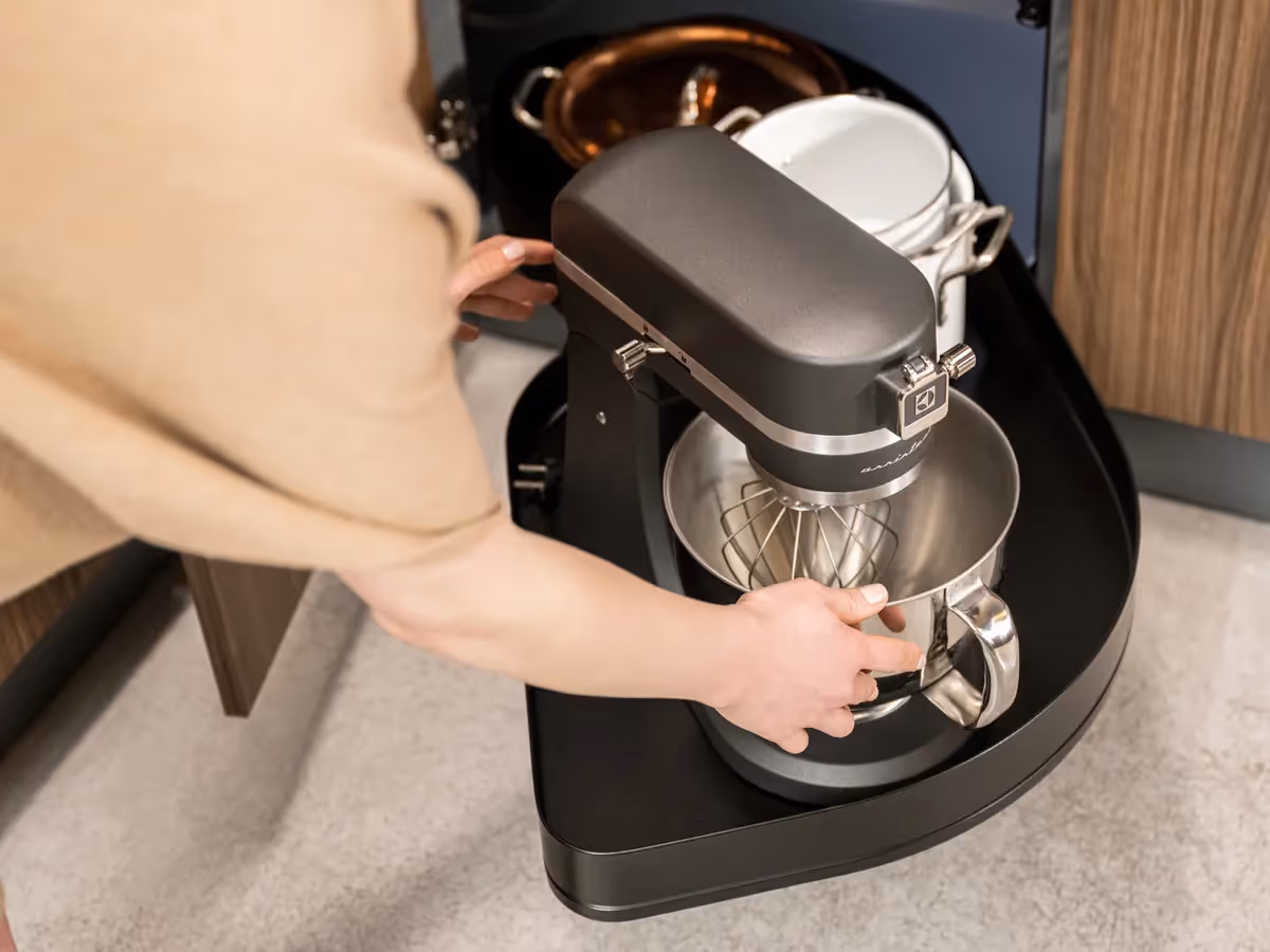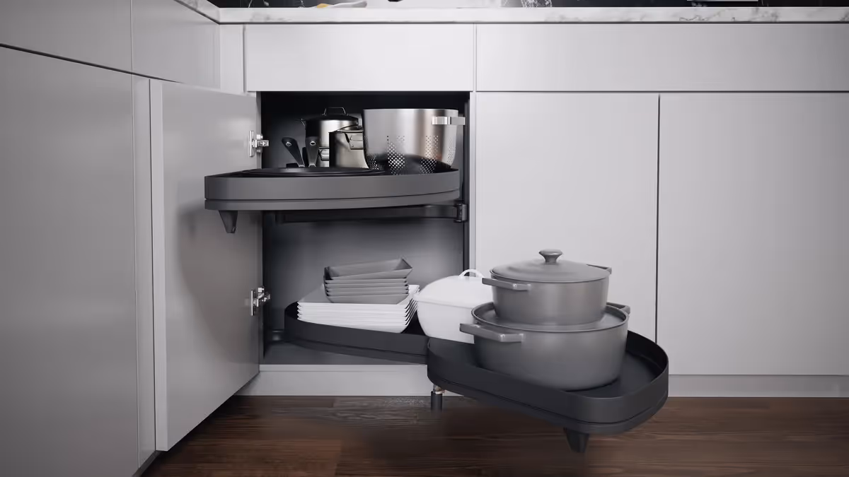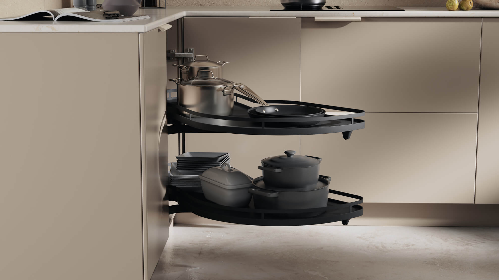 LeMans cucina il potenziale di una soluzione per angolo cucina : grazie ai suoi ripiani dalla forma organica, offre fino al 70% di spazio in più rispetto ai classici cassetti accanto all'angolo "morto".