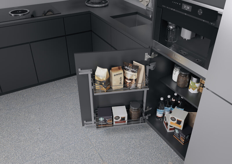 Apertura e rimozione simultanea di tutte le forniture con un solo giro - per una reale visibilità a 360° e un accesso diretto agli articoli depositati. I ripiani interni seguono il movimento dell'anta. Le cerniere assumono la funzione di chiusura e un ammortizzatore supplementare incorporato smorza l'apertura.