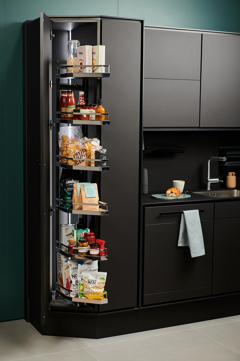 Un TANDEM Diagonal può essere perfettamente progettato nella zona d'ingresso di una cucina . Il pannello frontale smussato crea un ingresso spazioso e un'architettura armoniosa della cucina. Tutti i prodotti secchi per una famiglia in meno di 0,15 m² di superficie. Così anche le cucine piccole non devono più rinunciare ai vantaggi di una colonna.