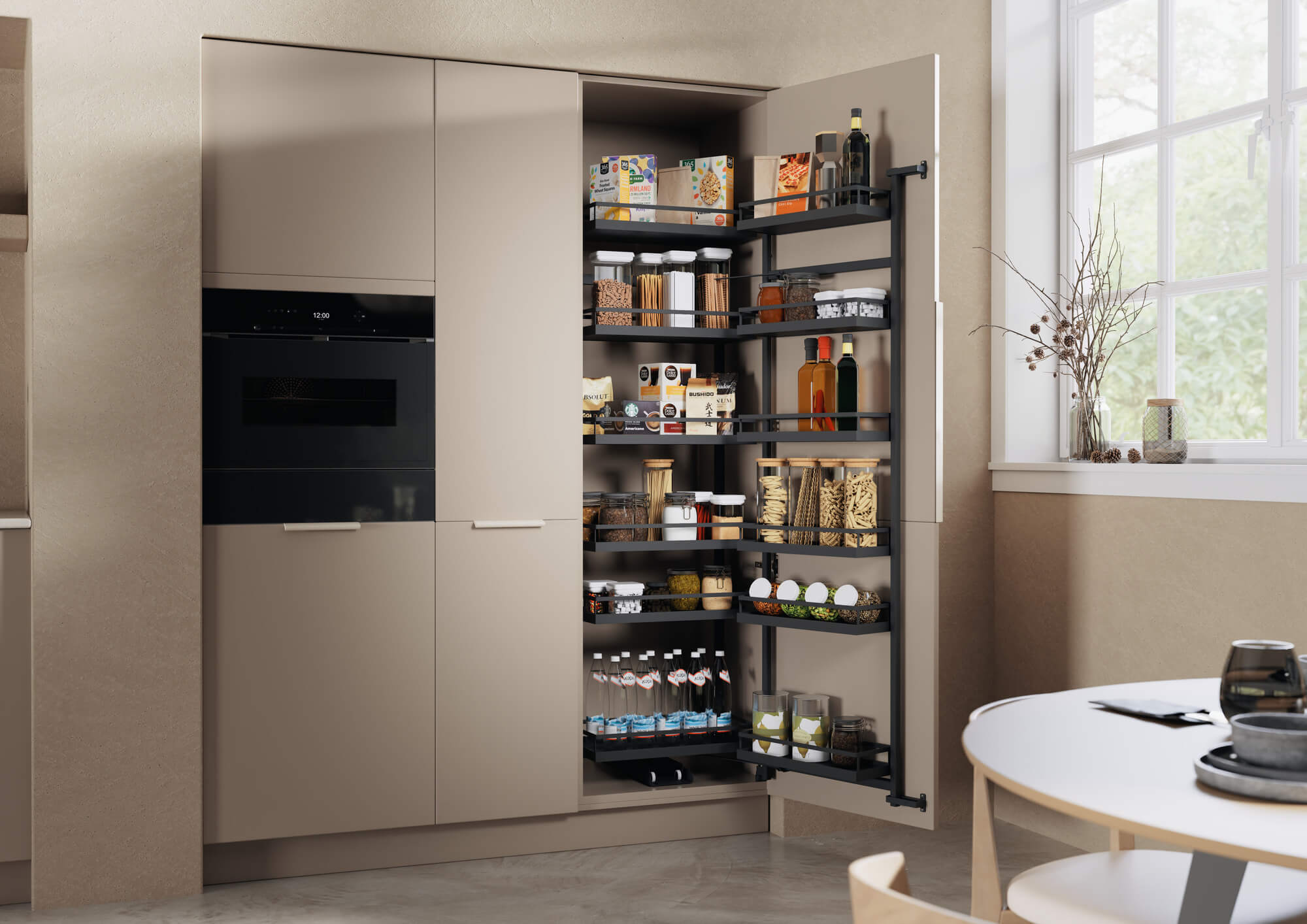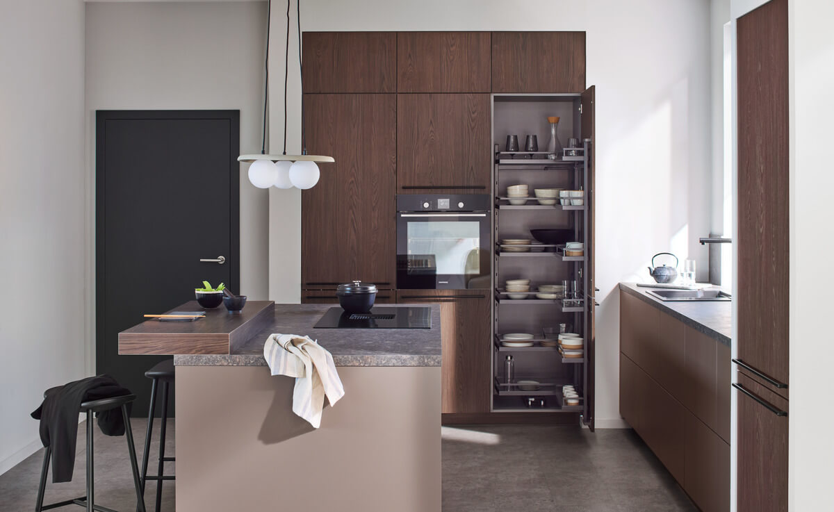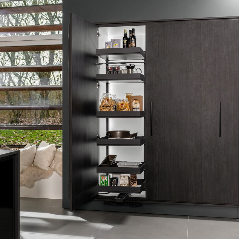 La famiglia TANDEM di Kesseböhmer offre all'utente non solo un'esperienza di apertura caratteristica con un solo gesto, ma anche una panoramica completa e un comodo accesso a tutte le provviste contemporaneamente. TANDEM è un sistema sofisticato che rende una colonna dispensa efficace e funzionale. Infatti, quando si apre l'armadio, il contenuto si divide in due "sottoinsiemi". La prima viene mobile davanti al mobile con la porta, la seconda, ovvero la parte posteriore del contenuto dell'armadio, viene automaticamente spostata in avanti. Questo principio è particolarmente impressionante se si progettano due armadi TANDEM come armadi dispensa nella cucina .