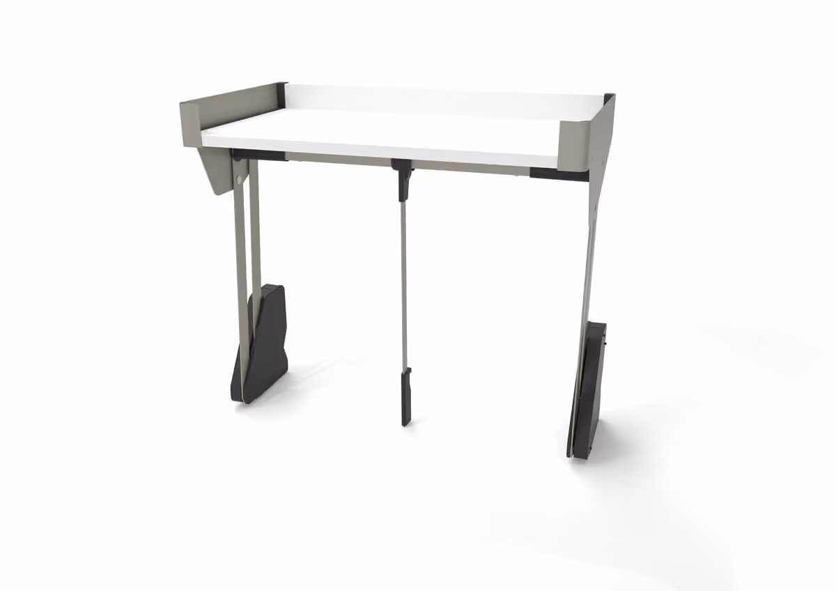 L'interazione unica tra la cinematica del sollevatore e la leva di comando consente un sollevamento quasi senza sforzo, anche a pieno carico e per l'intera distanza di sollevamento. Il collegamento fisso tra la barra della maniglia e la barra appendiabiti agisce come una leva estesa. L'intera forza di sostegno del cinematismo entra in funzione subito dopo l'azione della leva. La sincronizzazione dei bracci di leva garantisce una rotazione parallela, anche in caso di peso non uniformemente distribuito.