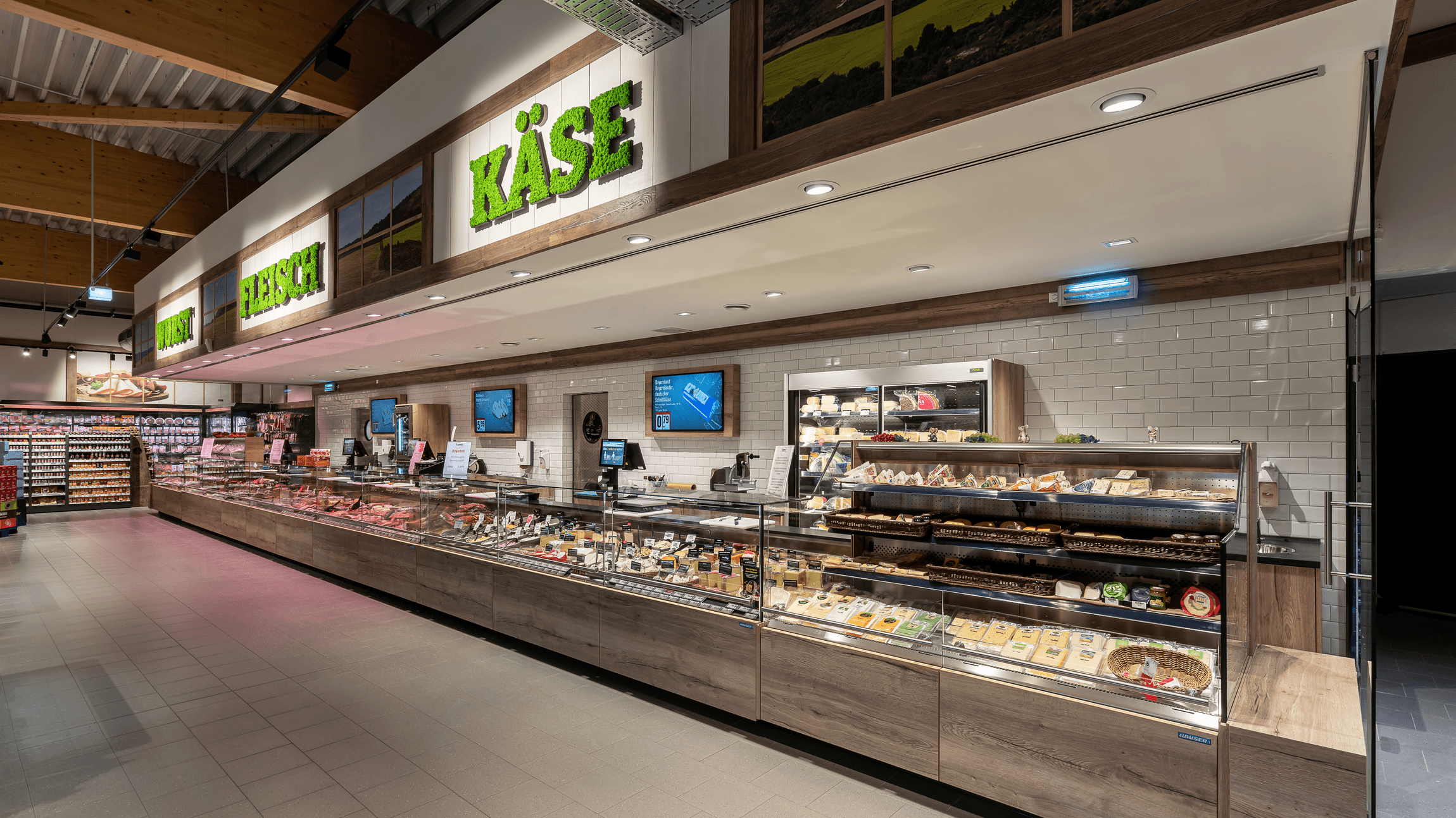 Komunikacja i impulsy zakupowe przy wejściu do sklepu: fartuch nad ladą jest ważnym elementem projektu. Dzięki centralnej pozycji przy ladzie ze świeżą żywnością, oferuje on wyjątkową możliwość komunikowania się z klientami w ukierunkowany sposób. Zwykle efektownie zaprojektowany, pomaga klientom nawigować do lad ze świeżą żywnością i obszarów usługowych zaraz po wejściu do sklepu. Należy również zwrócić uwagę na zastosowanie gładkich i błyszczących powierzchni w obszarach usługowych. Często stosuje się tu łatwe do czyszczenia materiały, takie jak płytki.