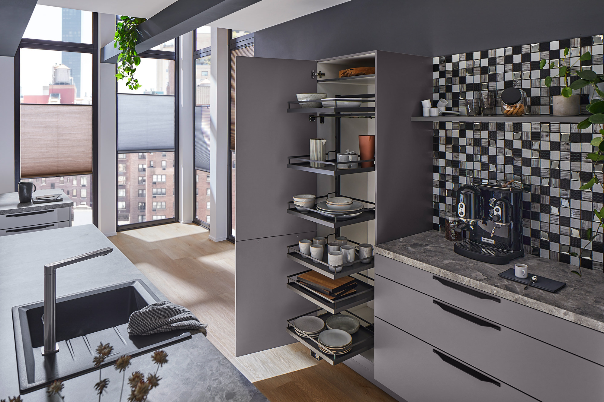 Das charakteristische Öffnungserlebnis, das alle Elemente durch eine fließende Bewegung verbindet, bietet der Schrankauszug TANDEM solo auf ganz einfache Weise. Die Tablare aus dem Innenraum folgen der Türbewegung, der Beschlag ist in Verbindung mit 110°-Scharnieren einsetzbar. Die Scharniere übernehmen die Schließ- und ein extra Dämpfer die Öffnungsdämpfung. Der Hochschrank für den Preiseinstieg in Kesseböhmer-Markenqualität.